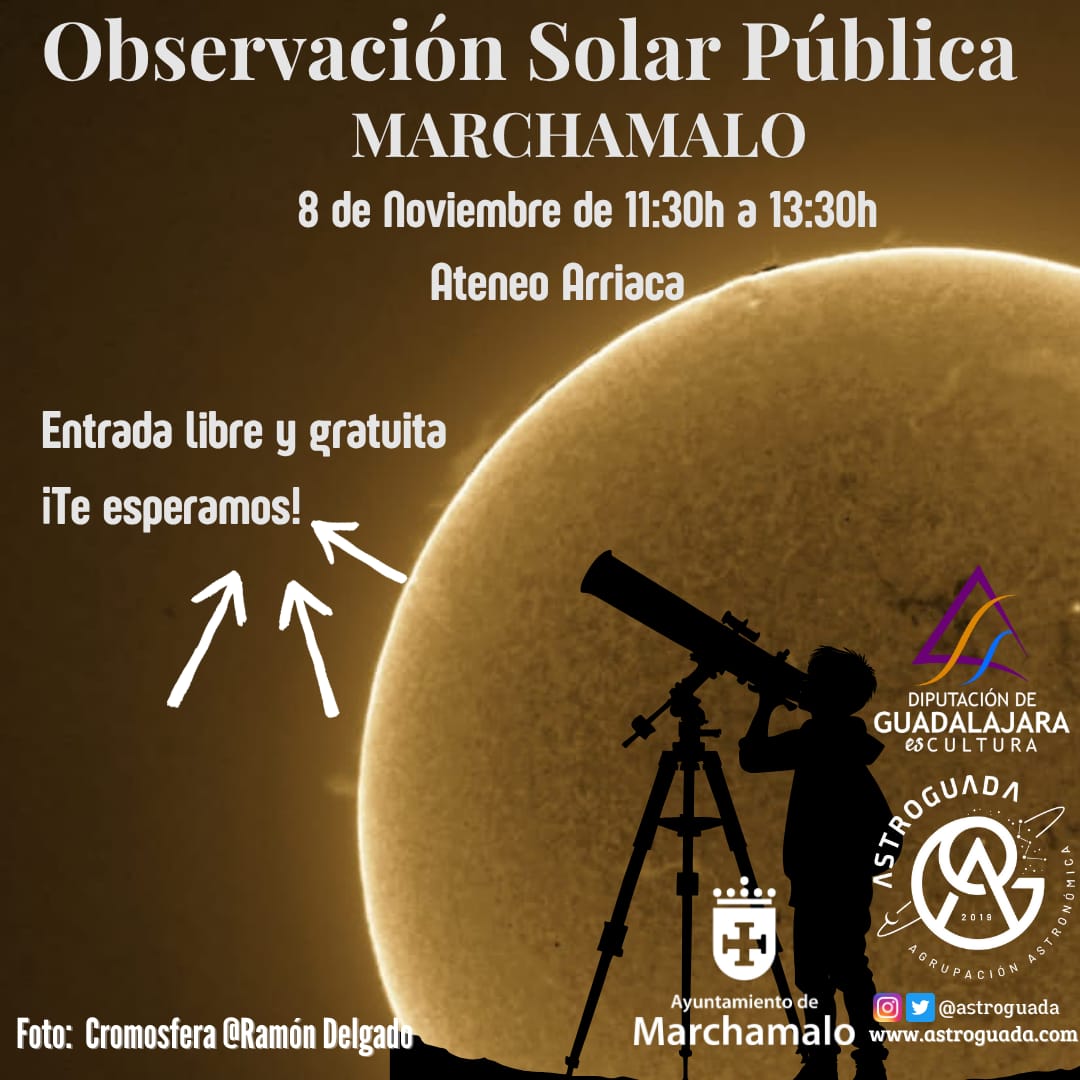 Observación solar pública en Marchamalo dentro de la Semana de la Ciencia. Descubre las manchas y protuberancias del Sol de forma segura con Astroguada. ⏰ Sábado 8 de noviembre, 11:30 h 📍 Marchamalo. |